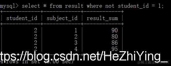 not运算符,查询除了1号学生的成绩