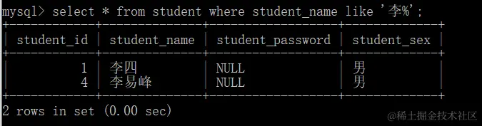 查询姓李的同学,名字只有两个字的