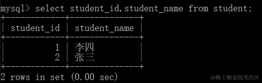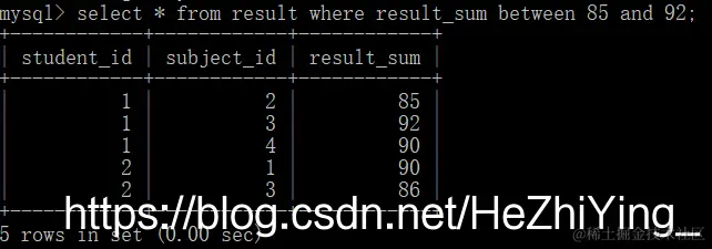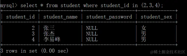 查询学号为2,3,4的学生,用in,in查询的是具体的一个或多个值