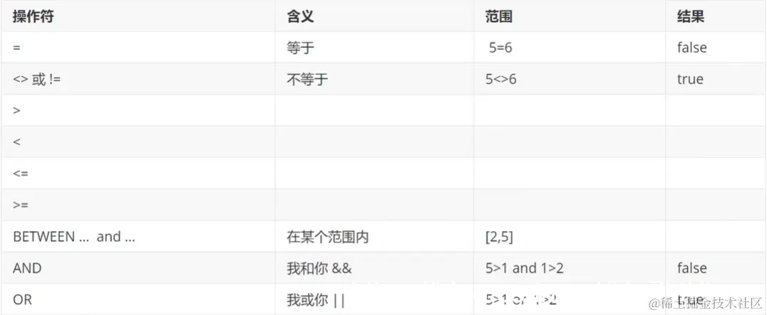 这里的where子句,我们用了=号,还有大于、小于、范围、与、或等