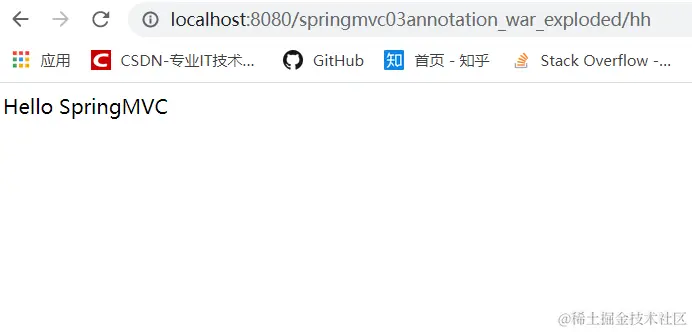 比起刚刚用xml配置开发的第一个程序HelloSpringMVC简单多了,当然在实际开发中也是用注解开发的,这里还是先给出一个HelloController,但是这里不用实现Controller接口了,而是用注解搞定