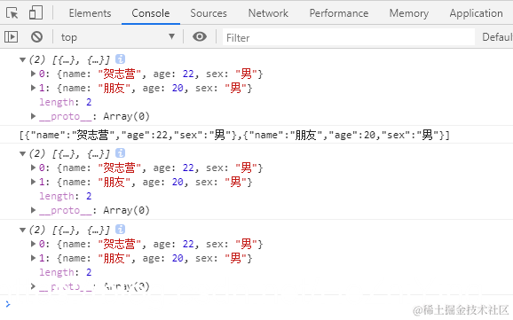 var data = '[{"name":"贺志营","age":22,"sex":"男"}, {"name":"朋友","age":20,"sex":"男"}]';