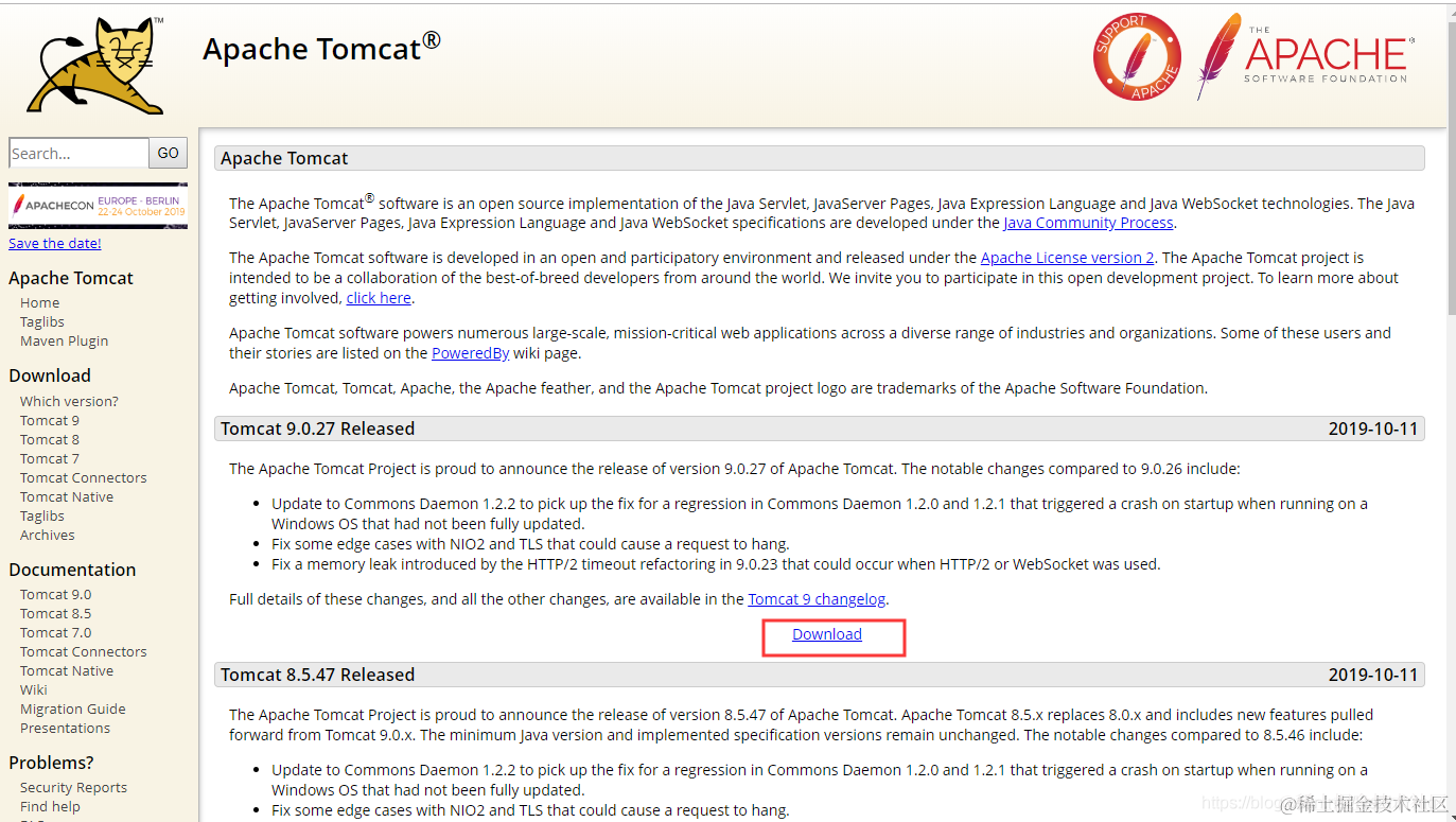 首先你需要下载一个Tomcat,这是Tomcat官网链接tomcat.apache.org/进去之后会看到这个界面