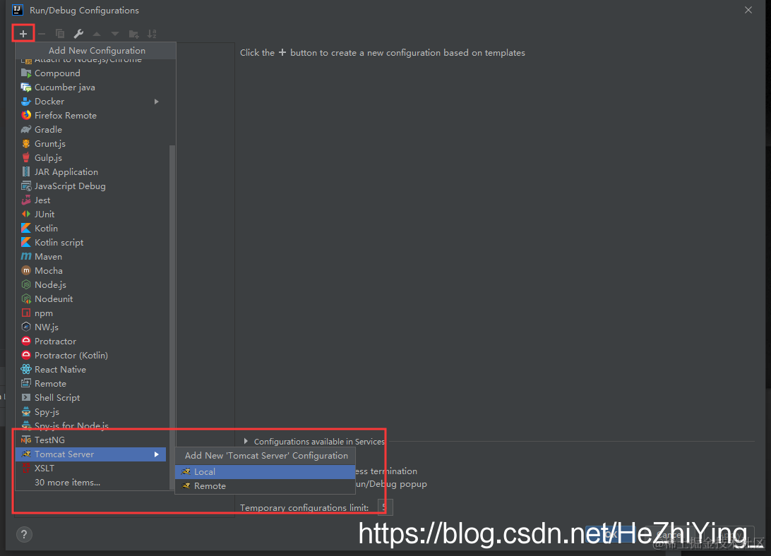 点击下图右上角红色框框如左图,然后点击+,找到Tomcat,点击local,如右图