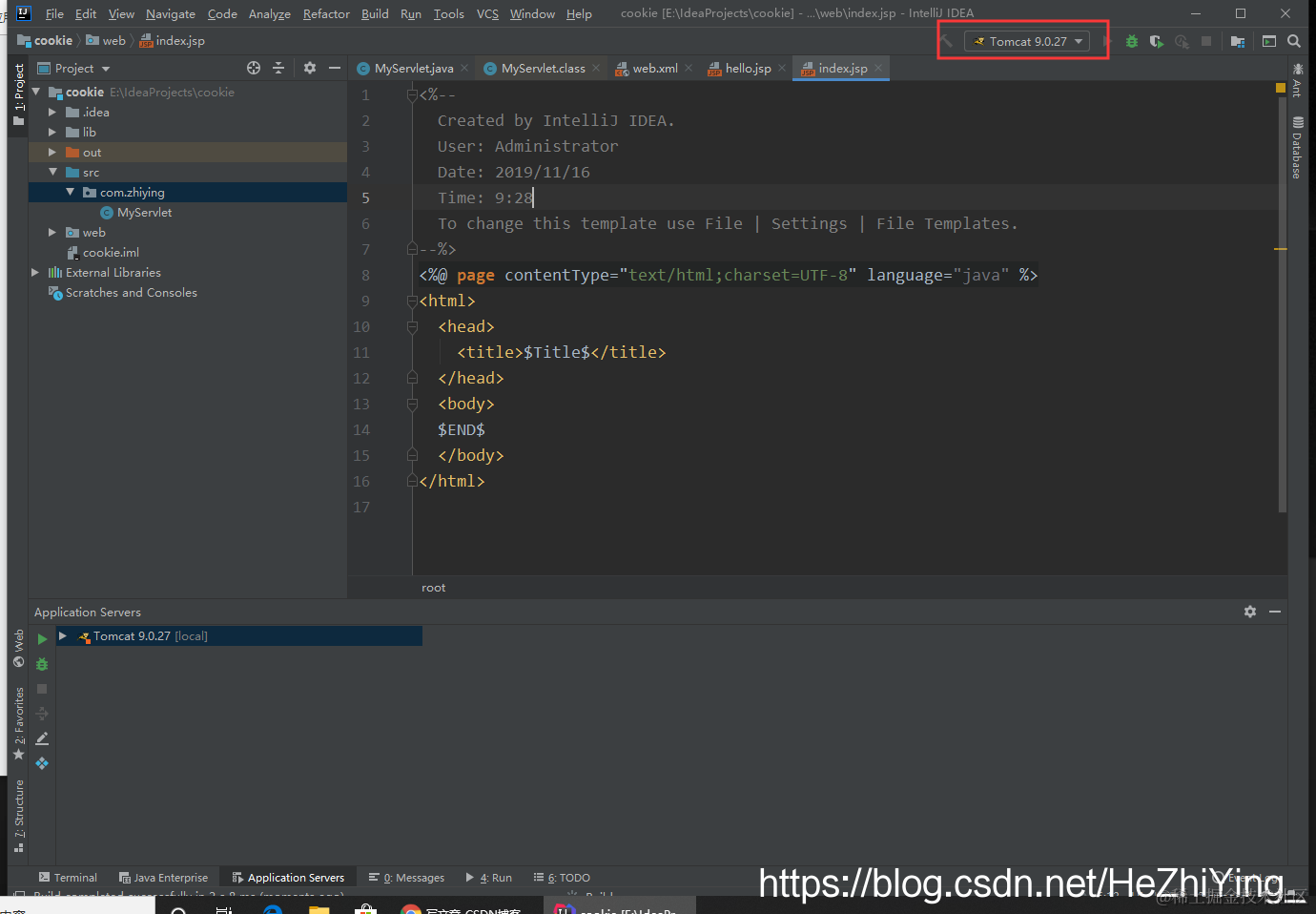 看到下左图红色框框,证明你的Tomcat已经集成到IEDEA中了,看到右图默认访问的是index.jsp,说明你的项目部署成功了