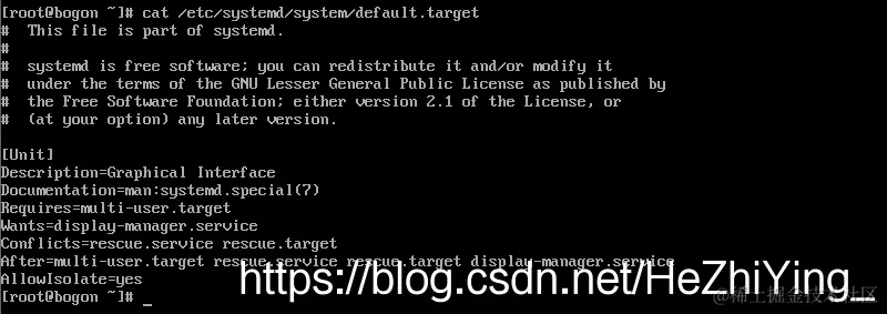 这里修改的配置文件在 /etc/systemd/system/default.target中,这里我输出一下该文件,该文件的配置是默认进入桌面的