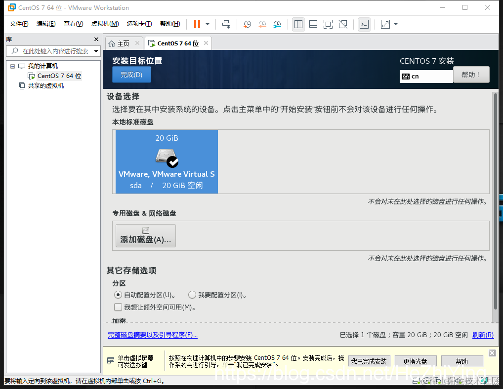 点击继续,你会看到一个有!的东西,然后点进去,选中这个20G的内存然后点完成