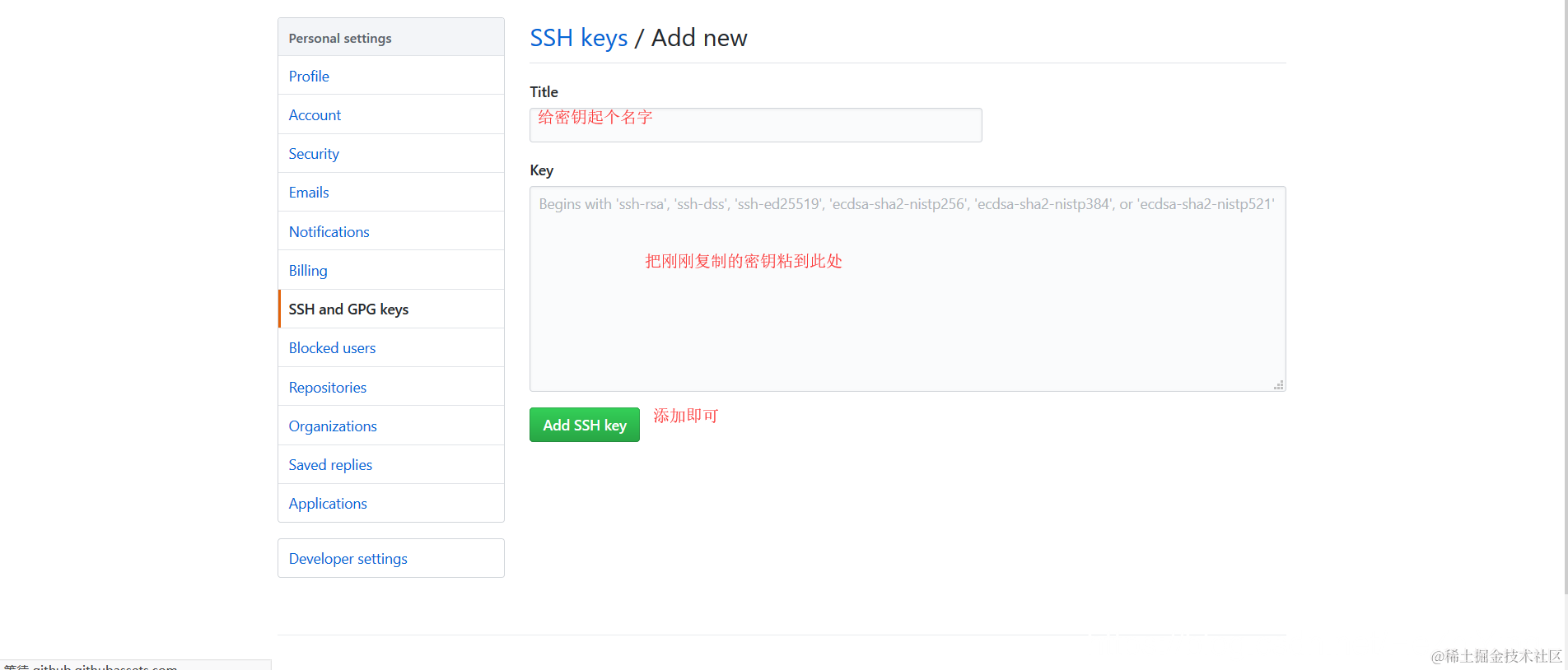 然后你就可以登录GitHub了,在那里创建一个仓库,然后把.ssh里的id_rsa.pub里的密钥粘过来