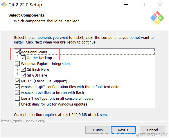 首先去官网下载一个Git,一路next即可,唯一需要注意的就是下图需要创建一个桌面快捷方式,如果只想要一个命令行版的,不要界面版的,可以把这个Git GUI Here取消勾选