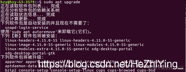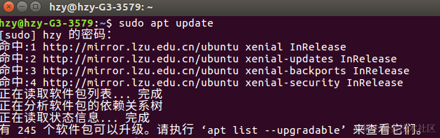 Linux系统更新并清除旧组建 已注销 2021-02-22 125 阅读1分钟 刚安装的Linux系统是Ubuntu16.04的,对于Linux系统来说,刚装上第一件事就是检查一下是否有可升级软件包了 检查升级命令 sudo apt update 看到这个界面,在这里是245个软件包可以升级(顺便说一下,这里的截图用的是Shift+PrintScreen) 升级命令 sudo apt upgrade 升级完之后,可能会存在一些旧组件,建议进行清除 清除旧组件 sudo apt autoremove 这里显示空出了59.4k的空间