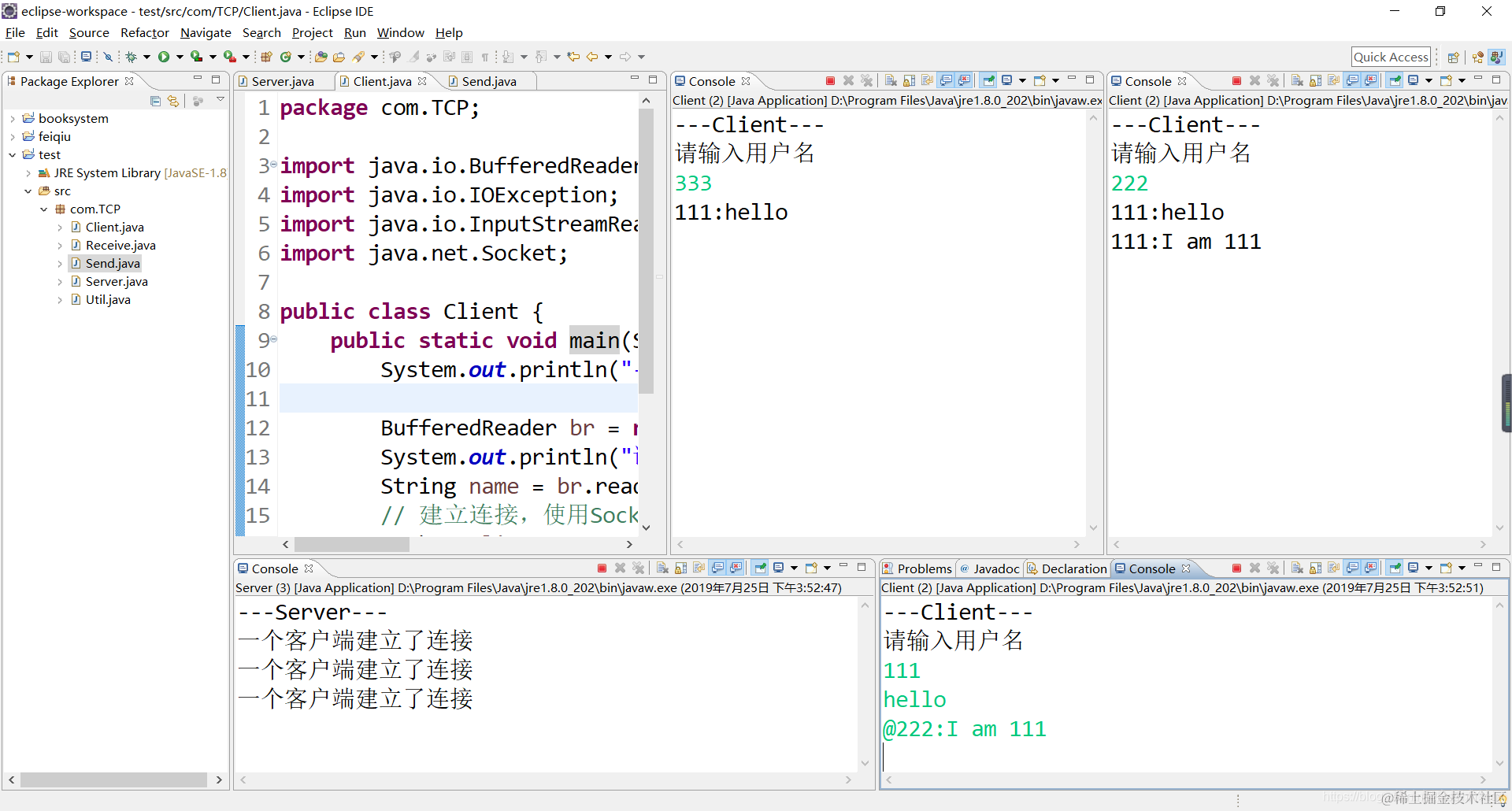 在实现客户端的时候,我这里是在控制台输入的信息,也可以进行跨级聊天,但前提是要在同一个局域网内,对于客户端来说,需要客服端进行发送信息和接收信息,首先看看接收信息吧