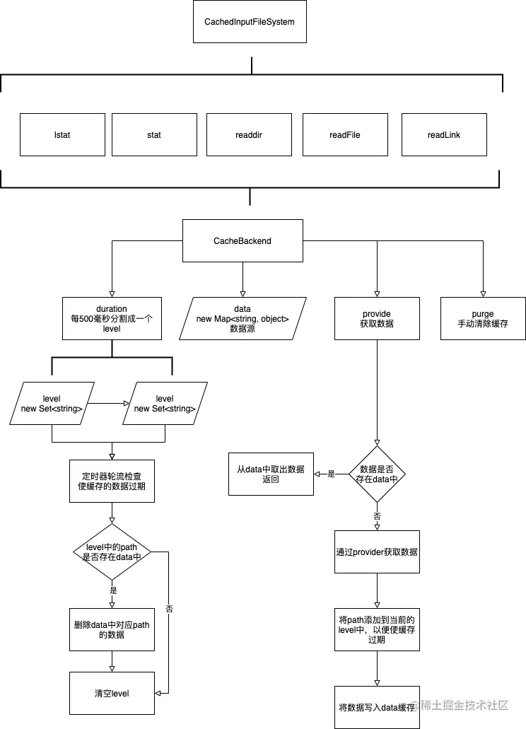 CachedInputFileSystem对node的文件(信息)内容读取方法做了一层封装,添加了缓存机制,缓存主要原理就是将文件路径与文件信息内容以kv的存储方式出入Map,把过期时间以500ms为一个单元拆成n个Set单元,再用定时器每间隔500ms使Set中的所有文件路径对应的内容删除实现内容过期。