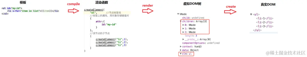 - Vue.js通过编译将template模版转换为渲染函数(render),执行渲染函数就可以得到一个虚拟节点树