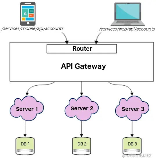 例如:/services/mobile/api/accounts和/services/web/api/accounts。API网关 基于不同的API确定来自哪个客户端,然后分别处理它们以返回不同客户端所需的资源。