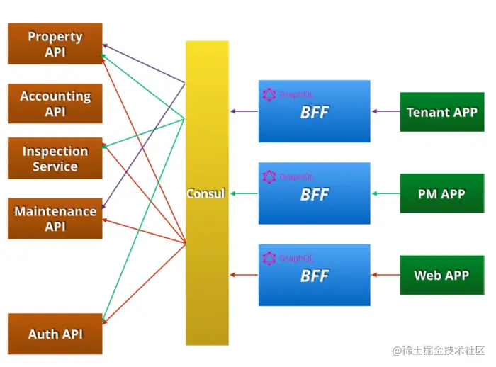 我建议使用express-graphql构建项目的BFF端,然后通过Docker进行部署,并且在BFF和微服务后端之间,通过Consul进行服务注册和发现。