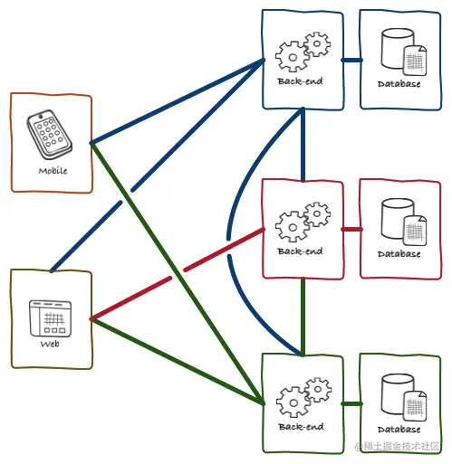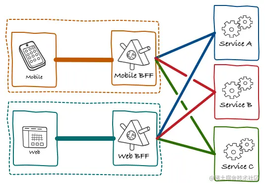 BFF的前端和后端体系结构的最大区别是,前端(移动,Web)不再直接访问后端微服务,而是通过BFF层对其进行访问。和每一个客户都会有一个BFF服务。使用BFF,微服务之间的相互调用较少。这是因为某些UI逻辑是在BFF级别处理的。