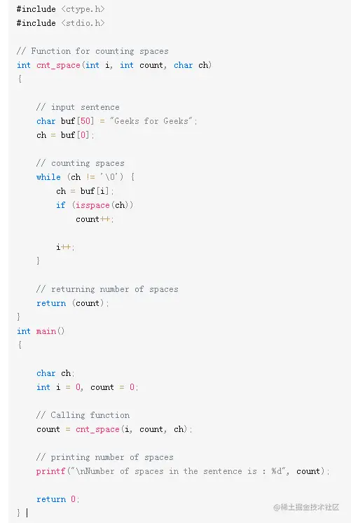 isspace()函数用于查找给定句子中的空格数。