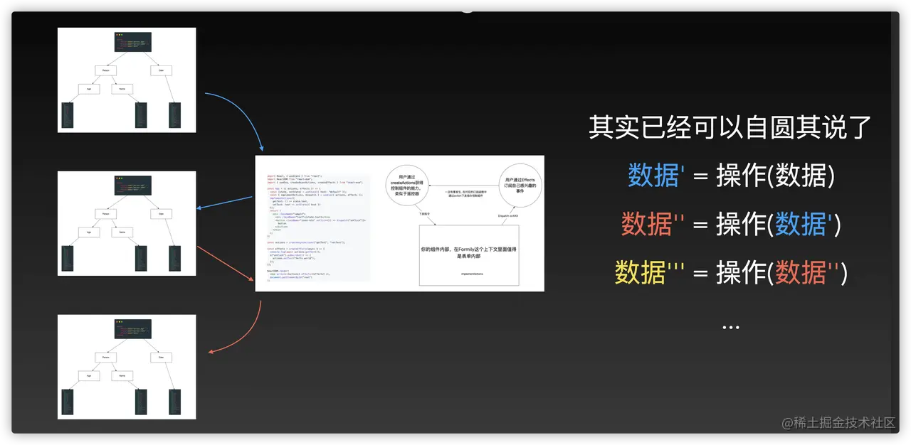 - 另一方面,如果 effects 和 视图层 hooks 有耦合,意味着你每次需要 effects 重新执行的话就需要 setState,不知不觉又变成了整表重绘,这可以看做是一种性能倒退,显然是作者不希望看到的。