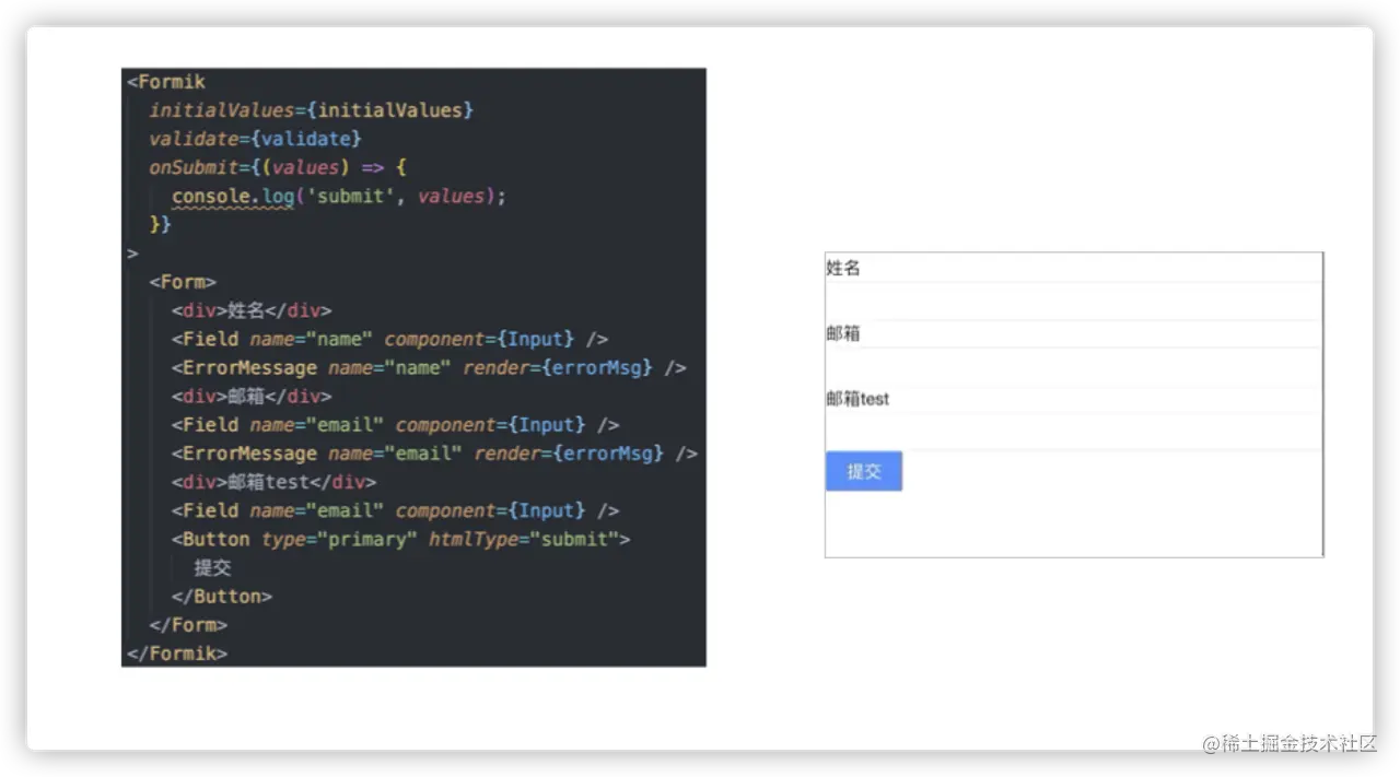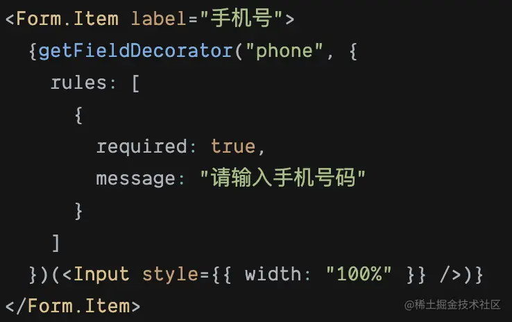 接下来我们可能会希望加上表单项的校验规则的定义,添加标题,声明 name,完成表单项与底层数据结构的映射,其实就是 Field 的作用。所以 Field 主要是帮我们解决了具体表单组件的状态绑定、校验绑定,以及其他的一些像 label 的设置甚至样式,错误信息展示等一系列通用的逻辑。