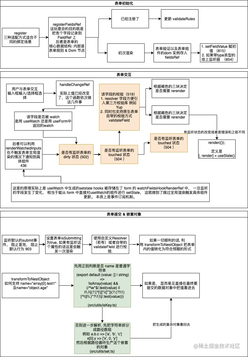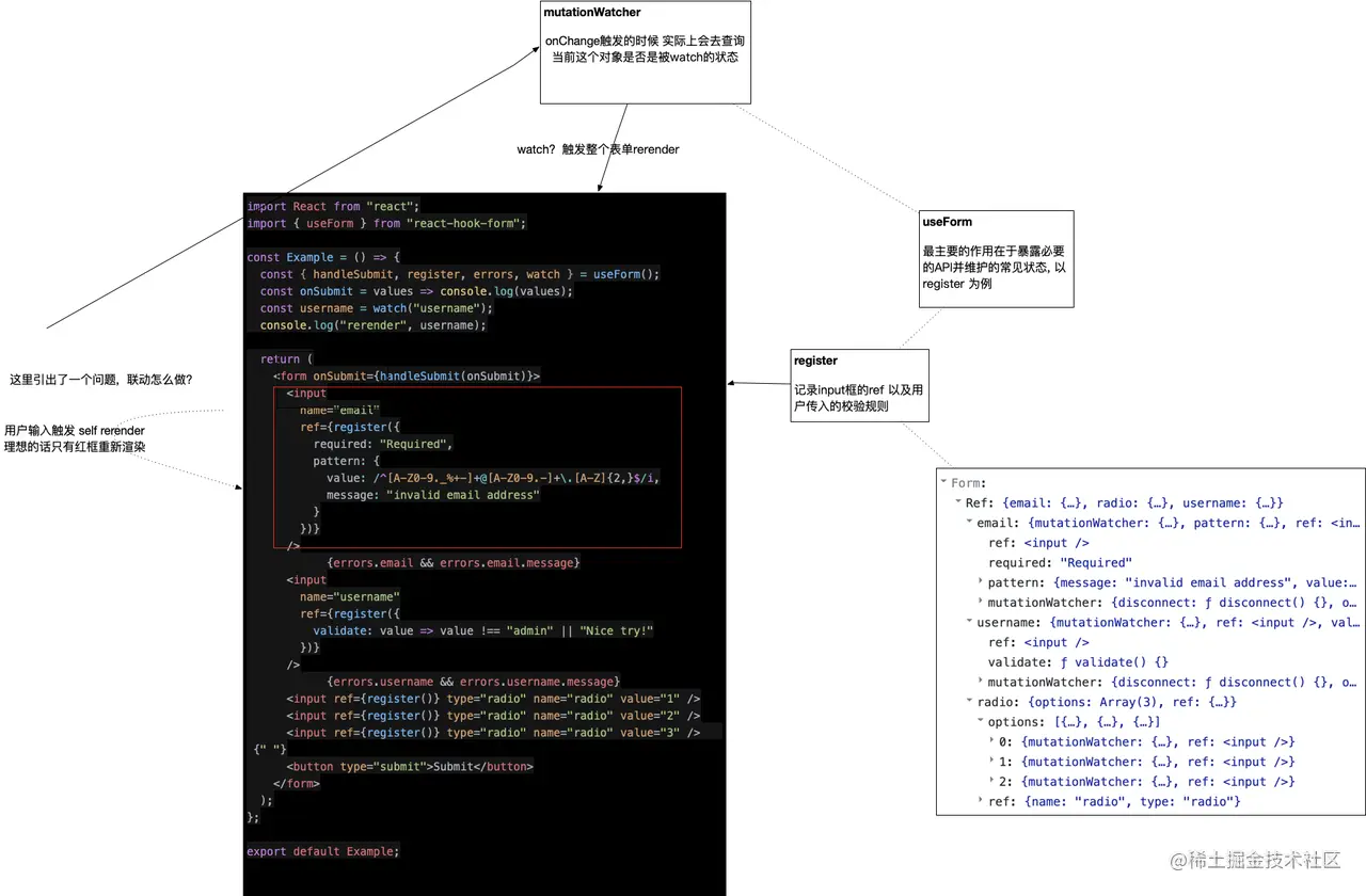 为了支持动态校验,react-hook-form 在进行表单注册的时候还会将 onChange、onBlur 等事件挂载到表单组件上,保证对与用户输入、修改行为的监听,从而可以对表单校验、表单值监听等进行触发。