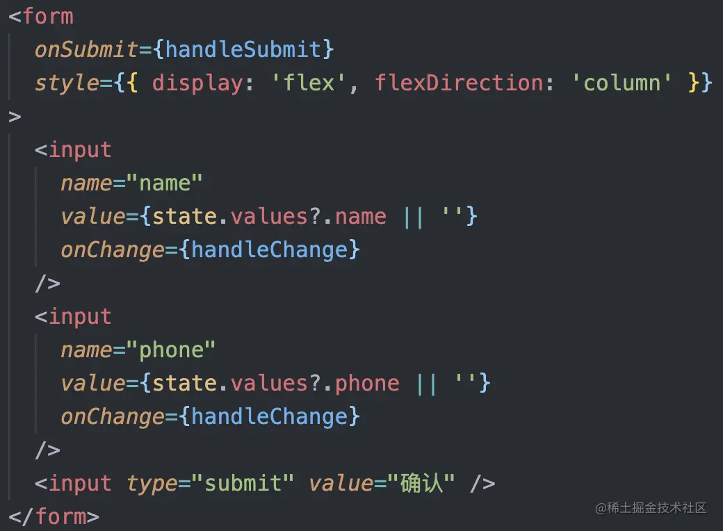 - 从受控的角度来讲,首先我们会定义一个 state 来管理表单的状态,然后我们会给每个表单组件挂载上 value+onChange。