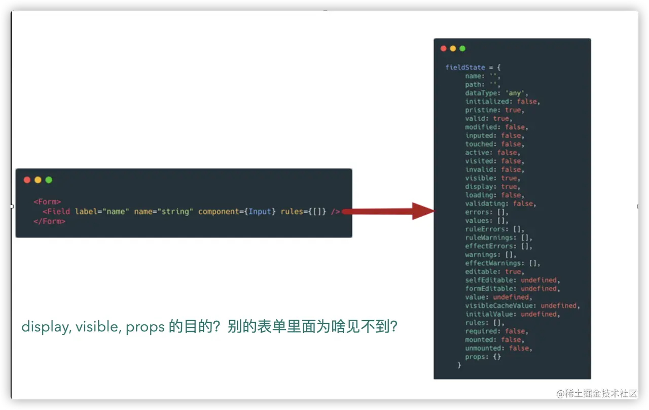 Formily 不但包括了这些,它甚至把某个字段的输入组件上被传入的 props,当前表单的挂载状态,显示状态都给描述出来了。这里反映出几点: