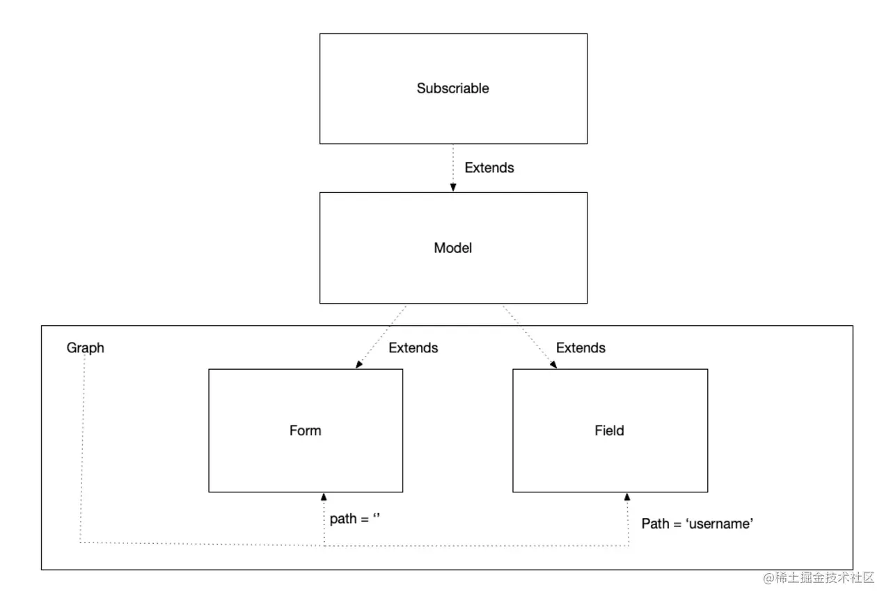 刚在说到表单中所有的事件都可以通过 effects 声明并监听,事实上,这一点在表单内部仍然成立。可以这么说, 整个 Formily 不论内外,都是一个基于一个简单的思想,一切结构可订阅,譬如他的类继承模型如下: