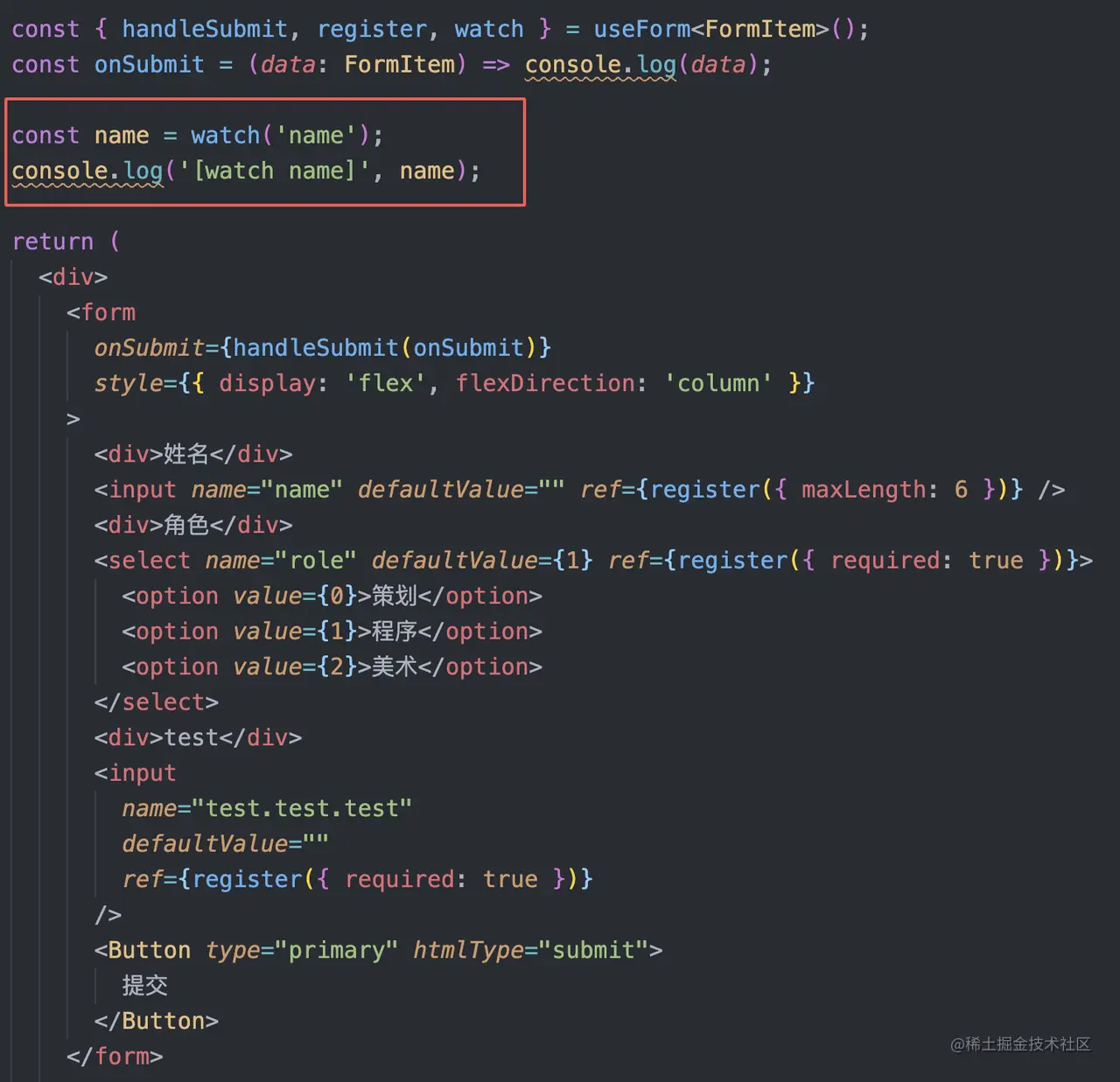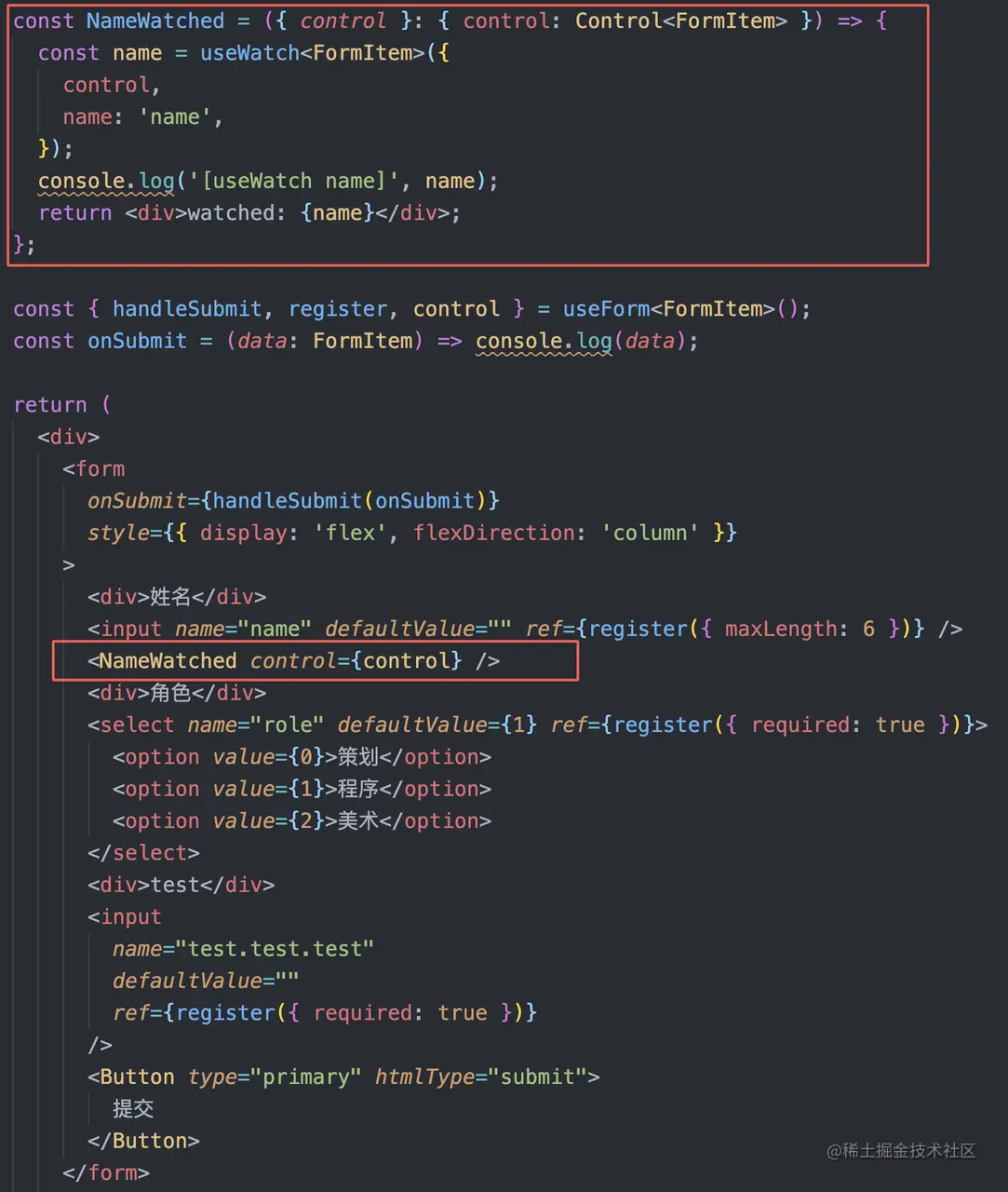 其实两者是存在性能差异的,useWatch 可以认为是把更新移到了更局部的位置,所以性能上会更有优势:
