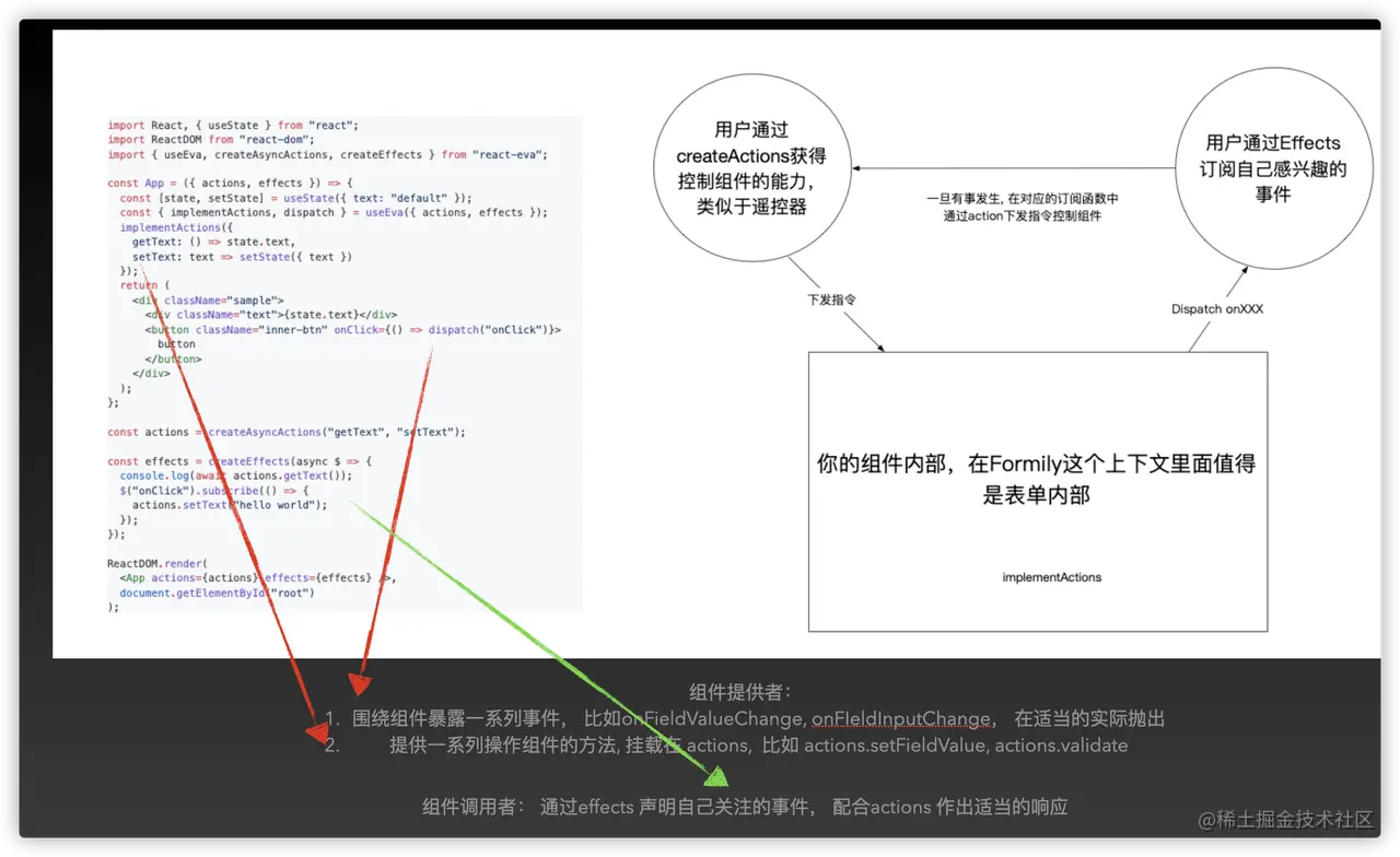 其实这套写法并不是空穴来风,effects + actions + rxjs 这套组合也是作者自创的,为此专门还专门抽象了一个库,叫 react-eva,想法很明确,即围绕 rxjs 针对 react 组件做的一个内外通讯方案:
