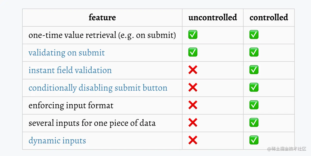 我个人认为这个图实际上是有问题的,下面所列举的一些非受控组件无法覆盖的场景,实际上 ref 配合组件 onChange 是可以做到的,例如字段级别实时校验,我们完全可以在字段上挂上监听函数,在其值发生改变的时候进行字段校验,然后通过 ref 控制组件的内部状态。所以我认为上述场景并不能作为不推崇非受控组件的理由。