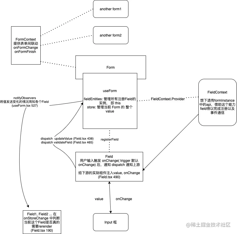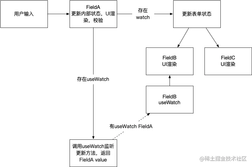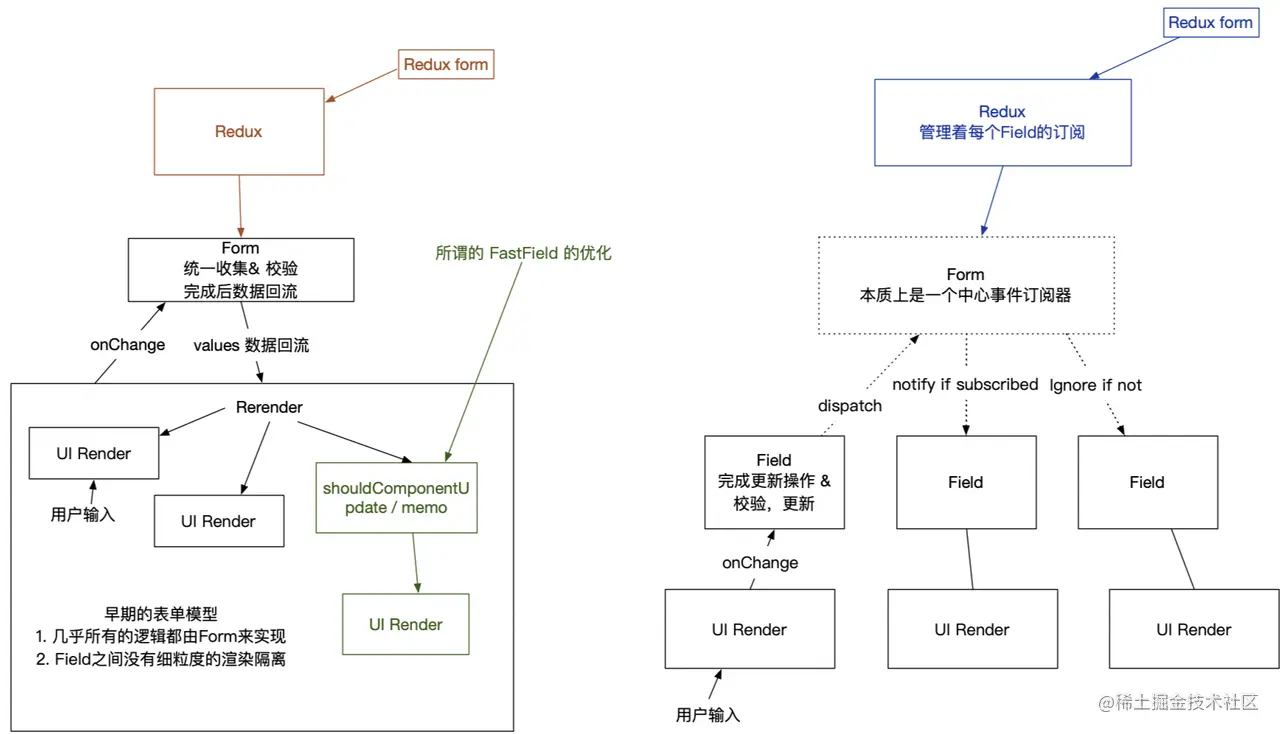 后面 rc-field-form 以及其他一些表单都采取了自己独立更新,依赖项目走订阅更新的路子,这本质上就是带来了更好的通信效率及更优秀的表单性能。