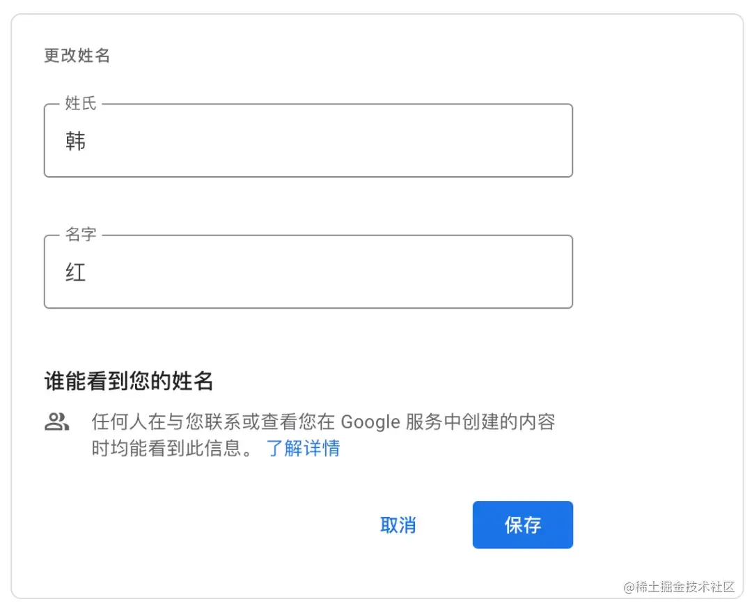 实际上广义上的表单并不是特别好界定,维基上讲表单是一系列带有空格的文档,用于输写或选择。更具体的,在网页中表单主要负责数据采集的功能,我们下文中所提到的表单都指后者。如下图展示的是 Google 个人资料中配置页面更改姓名的表单: