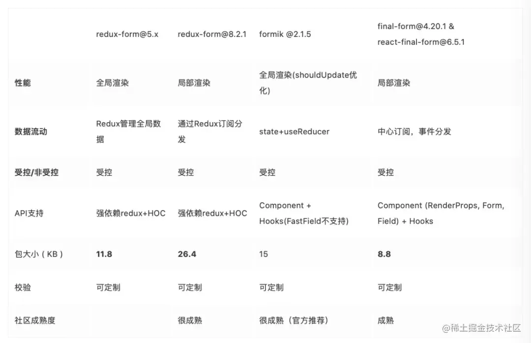 我们可以看到最开始的 redux form (< 6), rc-form,他们通过全量 rerender 之后新的 props 层层透传来把信息通知到每个 Field 上,这样信息的通信效率是很低的,表现上就是表单性能比较差。