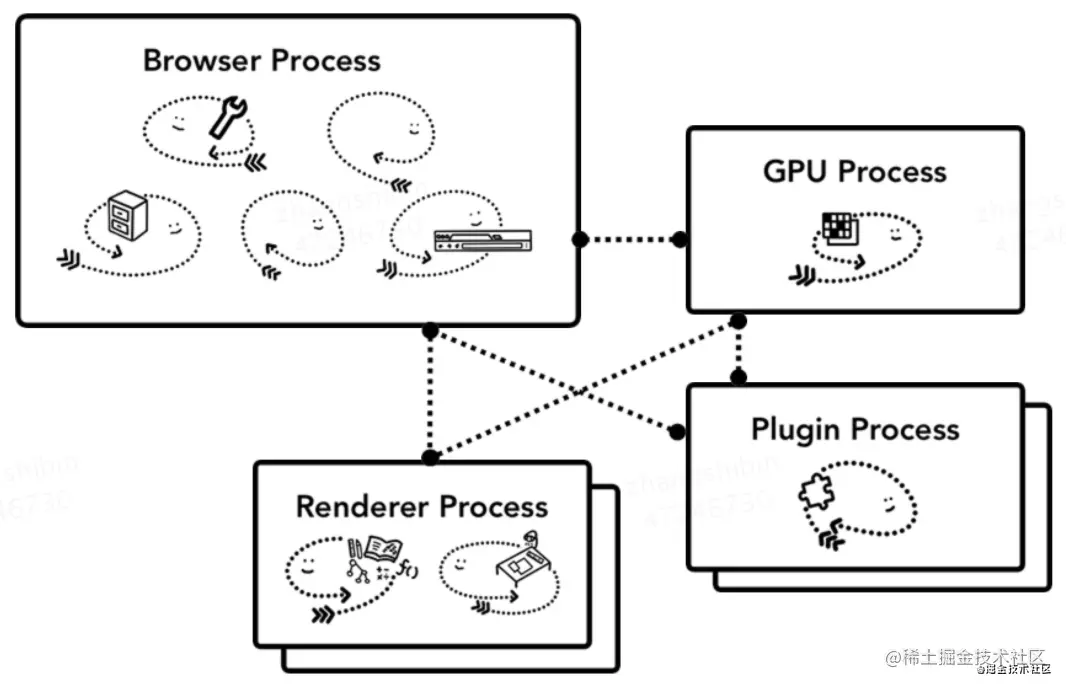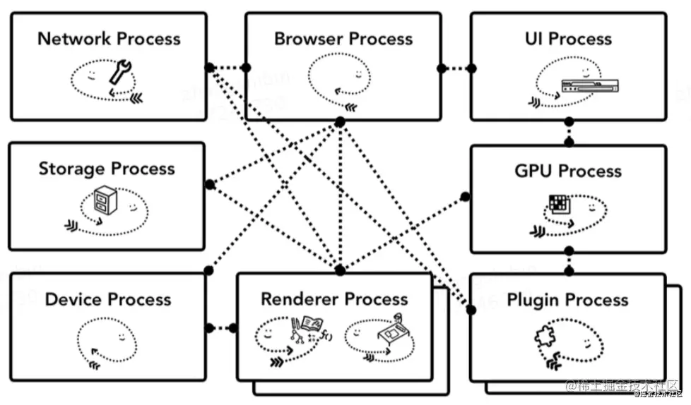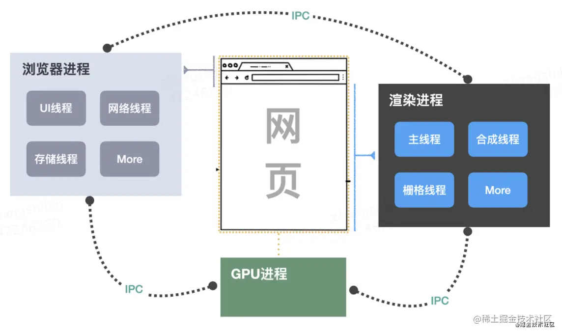 如下面这个框架图所示:浏览器组成分为:浏览器进程、渲染进程、GPU进程,多个进程之间都是通过IPC来进行通信的。