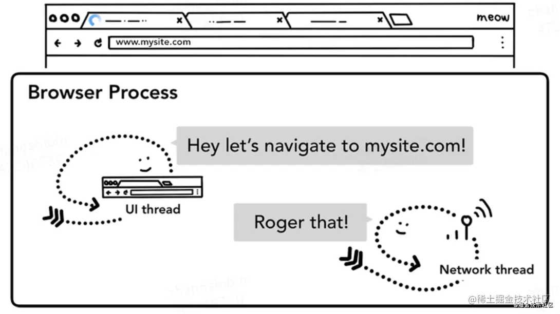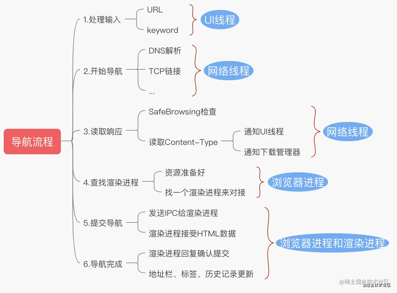 渲染进程接收数据,回复浏览器进程确认提交,浏览器进程就会把地址栏、标签、历史记录更新。到这里,整个导航流程就完成了。