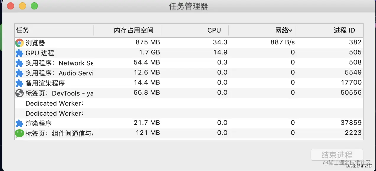 chrome的任务管理器可以看到不同的进程,如:浏览器进程、GPU进程等