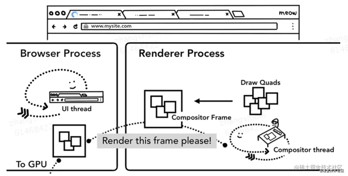 【GPU进程】会接收合成器帧,最终渲染显示在屏幕上。
