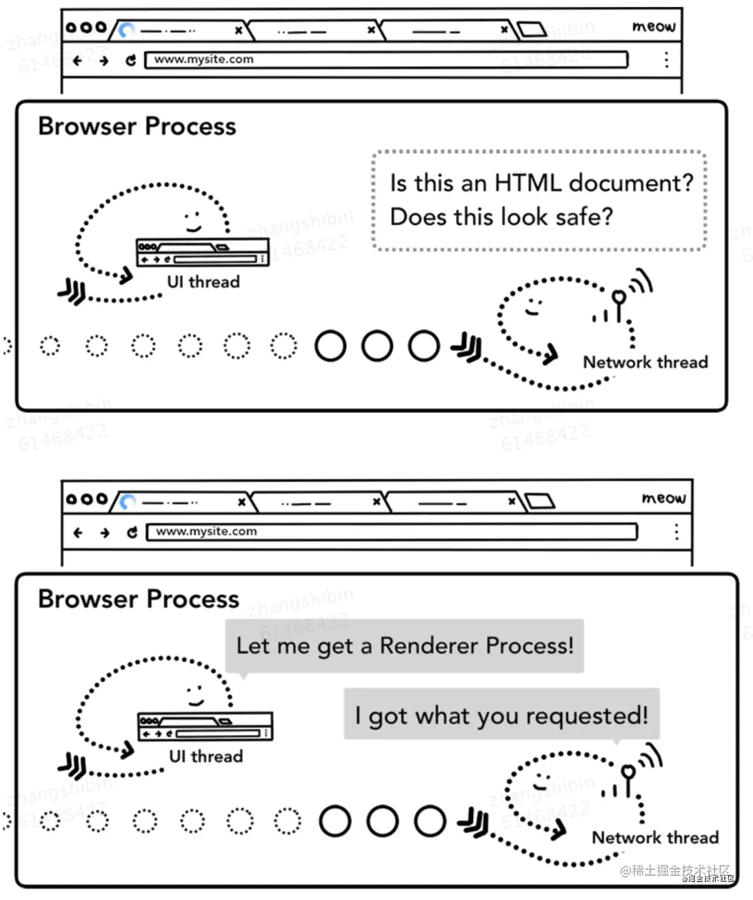 当资源和渲染进程都准备就绪时,浏览器进程发送IPC给渲染进程确认。
