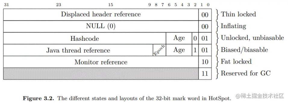 图3.2 展示了在Hotspot 32位下markword的不同状态和布局