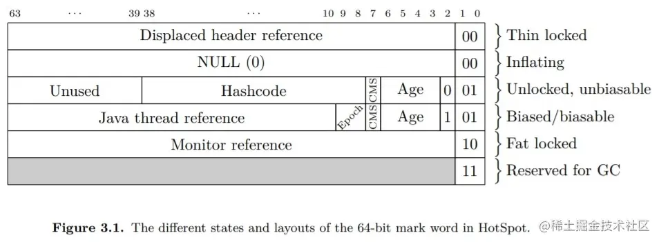 图3.1 展示了在Hotspot 64位下markword的不同状态和布局