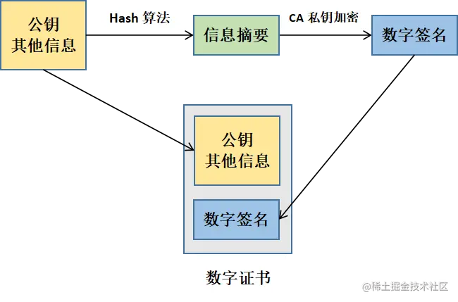 为了解决这样的问题,我们可以使用数字证书的方式,首先我们使用一种 Hash 算法来对我们的公钥和其他信息进行加密生成一个消息摘要,然后让有公信力的认证中心(简称 CA )用它的私钥对消息摘要加密,形成签名。最后将原始的信息和签名合在一起,称为数字证书。当接收方收到数字证书的时候,先根据原始信息使用同样的 Hash 算法生成一个摘要,然后使用公证处的公钥来对数字证书中的消息摘要进行解密,最后将解密的消息摘要和我们生成的消息摘要进行对比是否一致,就能发现我们得到的信息是否被更改了。这个方法最要的是认证中心的可靠性,即信任CA公钥,一般浏览器里会内置一些顶层的认证中心的证书,相当于我们自动信任了他们,只有这样我们才能保证数据的安全。可用下图理解数字证书的方式:
