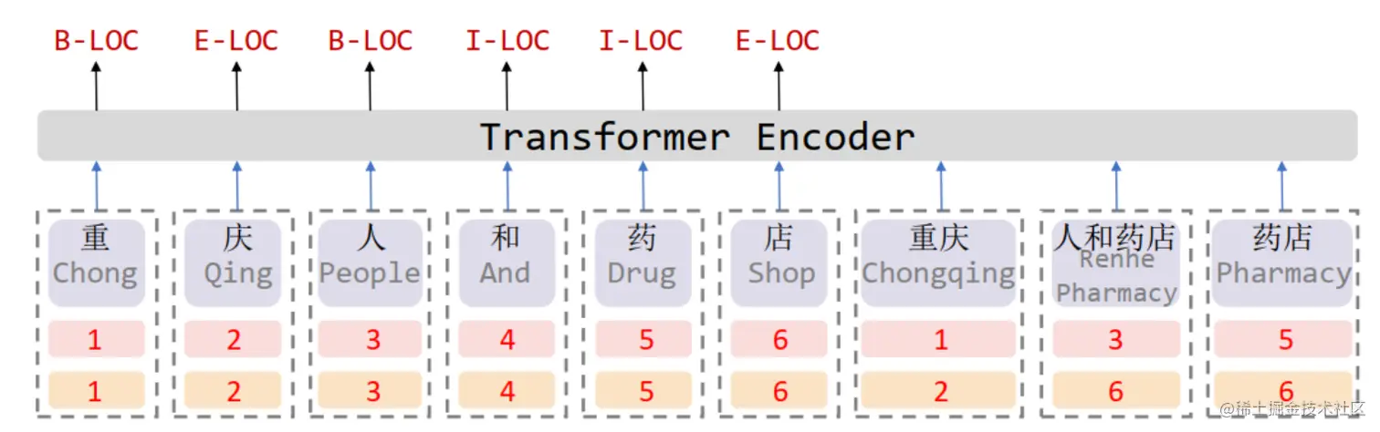 但是本文将潜在词和输入的句子进行了拼接,潜在词和潜在词之间有重叠,包含和分离三种关系(例如上图中 人和药店 和 人和),采用绝对位置已经无法满足,因此本文提出相对位置关系。