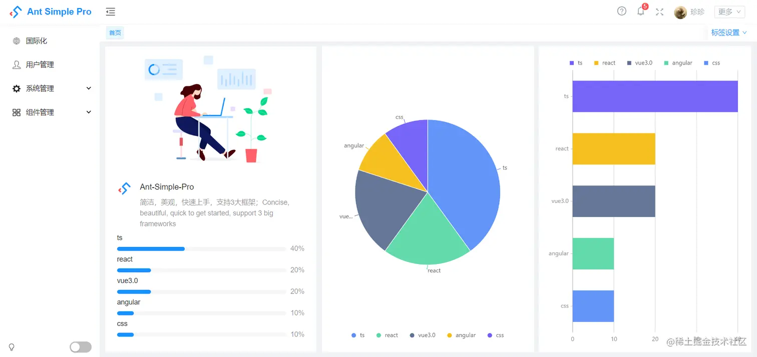 ant-simple-pro 是一款支持vue3.0,react,angular,typescript等多框架支持的中台前端解决方案,ui使用antd实现的,它使用了最新的前端技术栈,内置了 i18 国际化解决方案,动态路由,响应式设计,开箱即用,它可以帮助你快速搭建企业级中后台产品原型,不管你是vue开发者,还是react,或者angular,都能在这里找到你想要的版本。