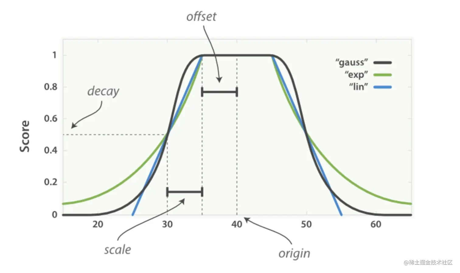 原点(origin):该字段最理想的值,这个值可以得到满分(1.0)偏移量(offset):与原点相差在偏移量之内的值也可以得到满分衰减规模(scale):当值超出了原点到偏移量这段范围,它所得的分数就开始进行衰减了,衰减规模决定了这个分数衰减速度的快慢衰减值(decay):该字段可以被接受的值(默认为 0.5),相当于一个分界点,具体的效果与衰减的模式有关 衰减函数还可以指定三种不同的模式:线性函数(linear)、以 e 为底的指数函数(Exp)和高斯函数(gauss),它们拥有不同的衰减曲线: