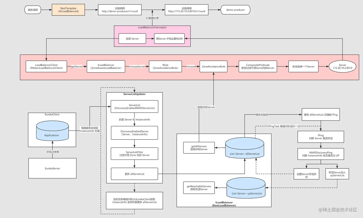 2、下面用一张图来总结下 Ribbon 这块获取Server的核心流程以及对应的核心接口间的关系。