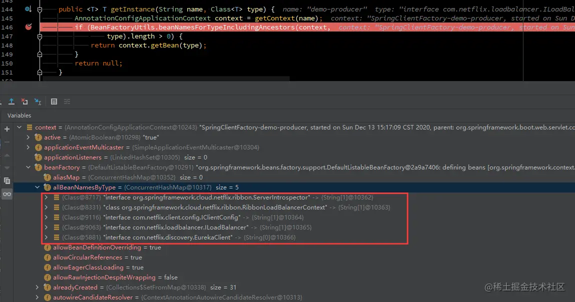 调试看下 AnnotationConfigApplicationContext 上下文,可以看到放入了与这个服务绑定的 ILoadBalancer、IClientConfig、RibbonLoadBalancerContext 等。