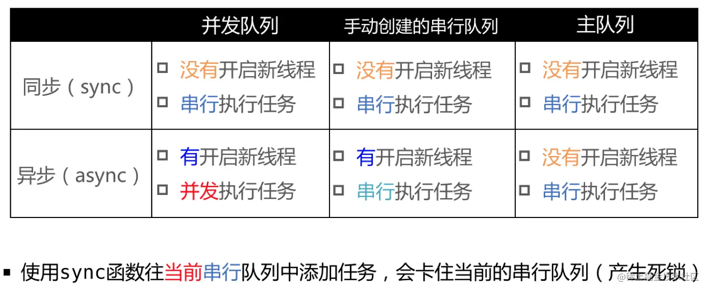 产生死锁条件: 使用sync函数往当前的串行队列中添加任务,会卡住当前的串行队列(产生死锁)
