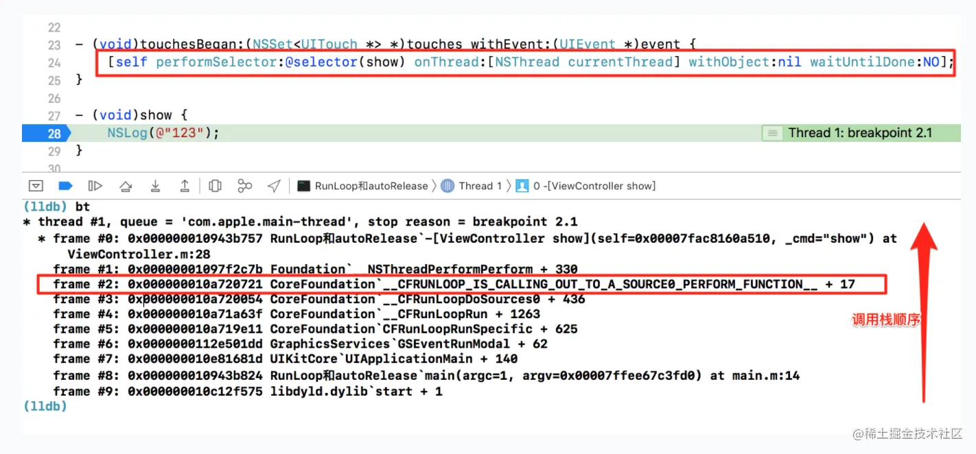 在 LLDB 中 打印 bt 就可以打印函数调用栈