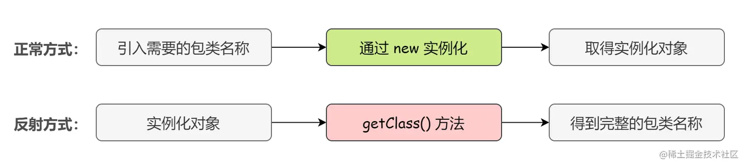说的再详细点,再解释一下。上文说过,在通常情况下,一定是先有类再有对象,我们把这个通常情况称为 “正”。那么反射中的这个 “反” 我们就可以理解为根据对象找到对象所属的类(对象的出处)