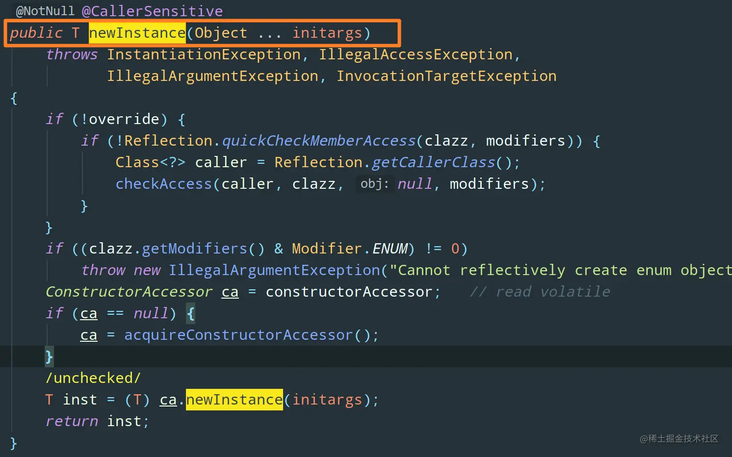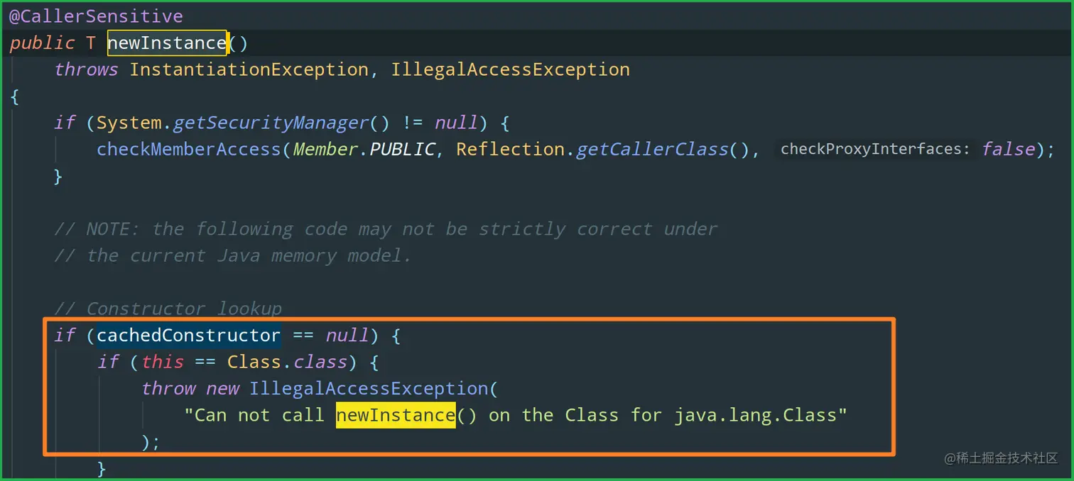 从上面代码很容易看出,Constructor.newInstance 是可以携带参数的,而 Class.newInstance 是无参的,这也就是为什么它只能调用无参构造函数的原因了。